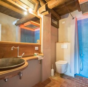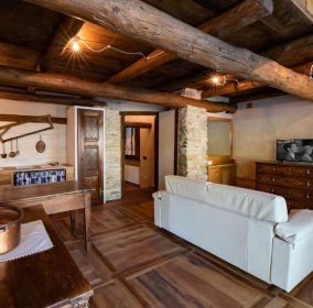 This 65m2 Superior two-room apartment can accommodate 2/4 people and is the most evocative of the structure with its round hydromassage tub inserted in a wooden trough, suitable for those seeking relaxation, comfort and attention.. The living area, dominated by a wooden ceiling with large old beams and chestnut planks, is composed of a living room with dining area, kitchenette with induction hobs, fridge and kettle with everything you need to prepare a good hot drink. You will also find a comfortable sofa, which can become a bed if necessary, and a TV.. In the bedroom, however, the barrel vault and the original brick floor frame a very large space where, in addition to the bed and the jacuzzi, there is a large shower and a sink. Also present is a bathroom, in addition to the main bathroom that has a second shower and is designed for people with disabilities.